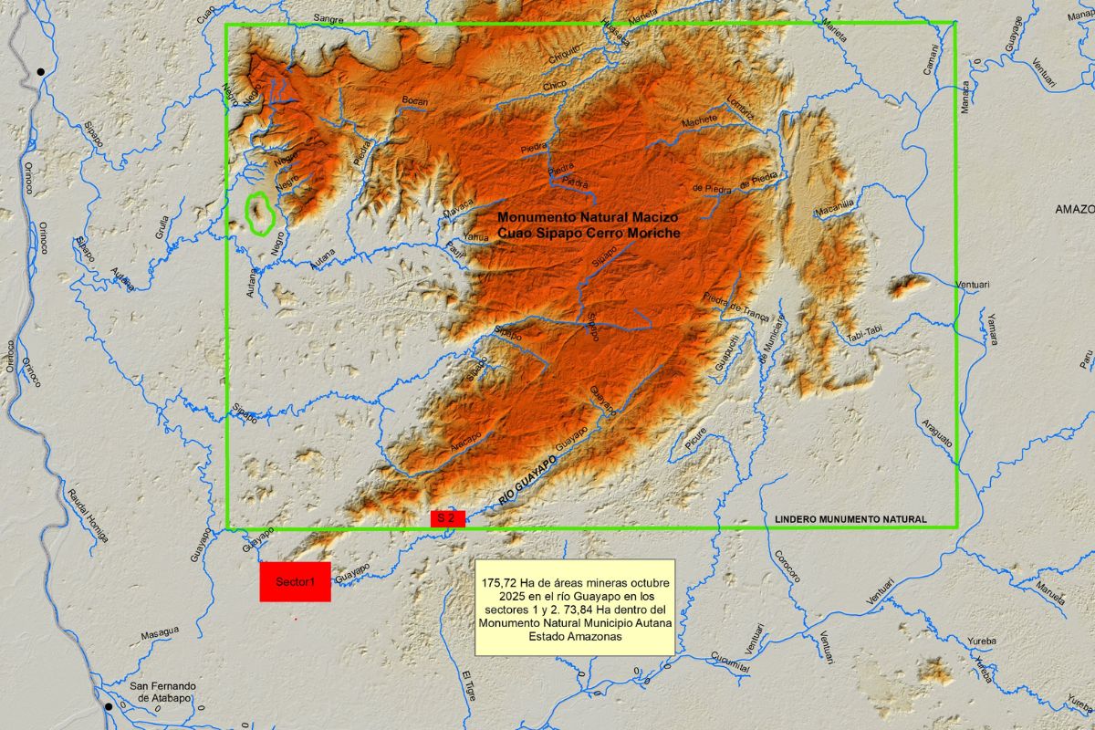 En su cuenta de X, SOS Orinoco alertó sobre la minería ilegal que abarca una importante extensión de territorio en sectores cercanos al afluente y dentro del Monumento Natural del Municipio Autana de Amazonas que comprende el “Macizo Cuao Sipapo – Cerro Moriche”.